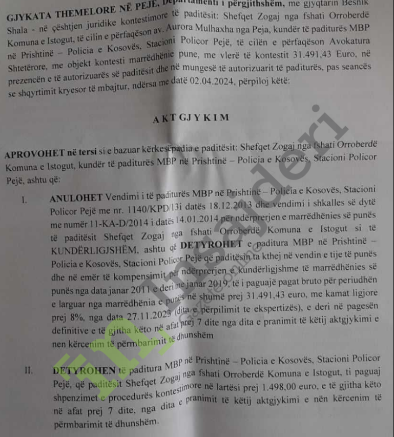 “ANULOHET Vendimi i të paditurës MBP në Prishtine- Policia e Kosovës, Stacioni Policor Pejë me nr. 1140/KPD/13i datës 18.12.2013 dhe vendimi i shkalles se dytë me numër 11-KA-D/2014 i datës 14.01.2014 për ndërprerjen e marrëdhënies se punës të paditësit Shefget Zogaj nga fshati Orroberdë Komuna e Istogut si të KUNDERLIGJSHËM, ashtu që DETYROHET e paditura MBP në Prishtinë Policia e Kosovës, Stacioni Policor Pejë që paditësin ta kthej në vendin e tije të punës dhe në emër të kompensimit për ndërprerjen e kundërligjshme të marrëdhënies së punës nga data janar 2011 e deri me janar 2019, të i paguajë pagat bruto për periudhën e larguar nga marrëdhënia e punës ne shumë prej 31.491,43 euro, me kamat ligiore prej 8%, nga data 27.11.2023 (dita e përpilimit te ekspertizës), e deri në pagesën definitive e të gjitha këto në afat pre/dite nga dita e pranimit të këtij aktgjykimi e nen kërcenim të përmbarimit te dhunshëm”, thuhet në vendimin e gjykatës.