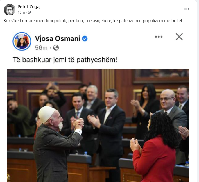 Kur s’ke kurrfare mendimi politik, per kurgjo e asnjehere, ke patetizem e populizem me bollek”, ka shkruar Zogaj.
