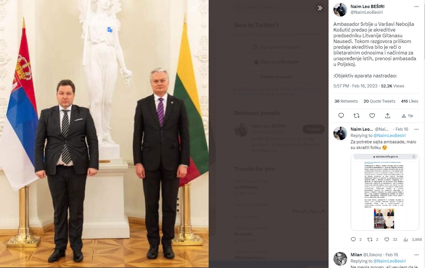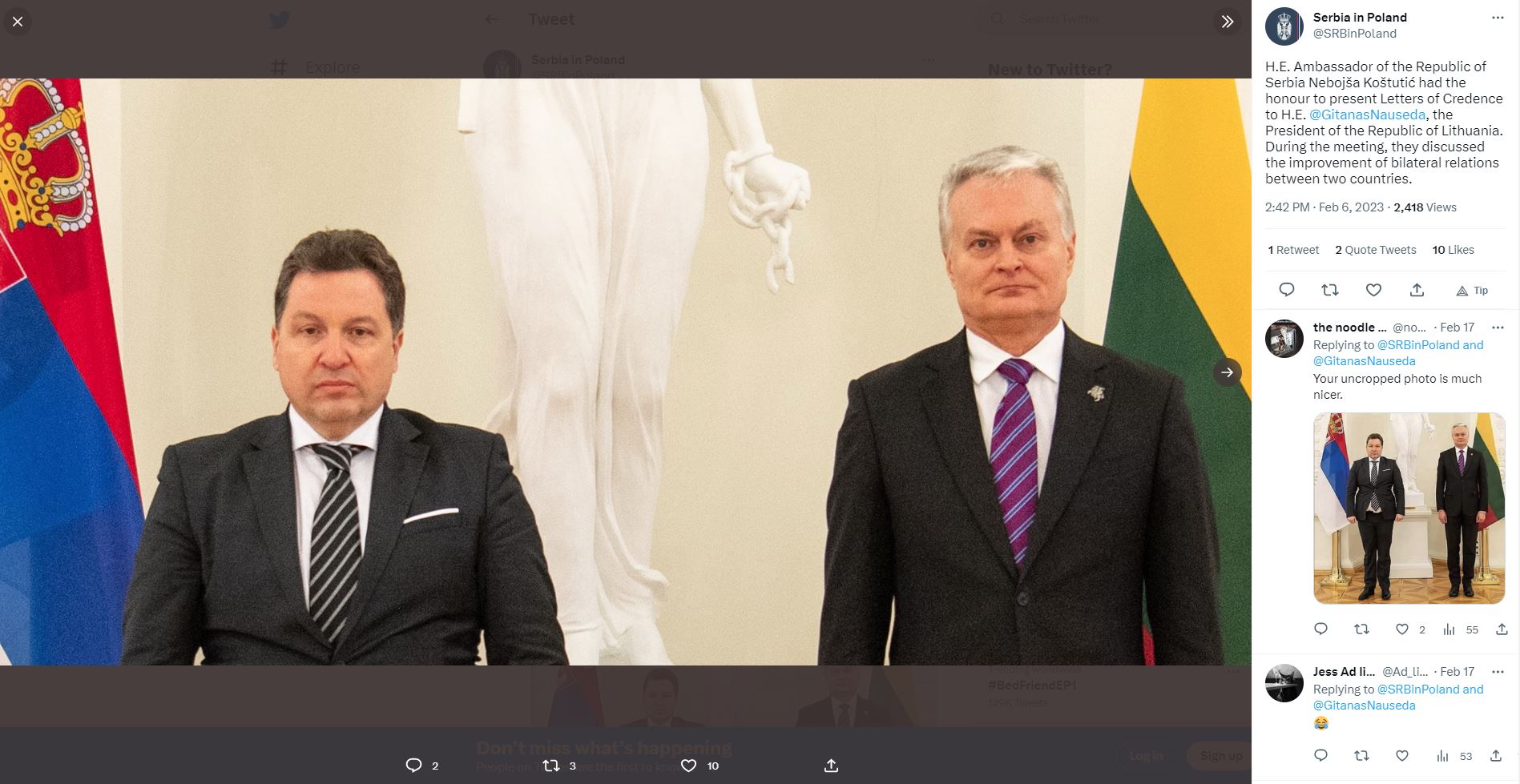 Për të fshehur shijen e diskutueshme të modës së ambasadorit të saj, Ambasada e Serbisë në Poloni e ka “prerë” pjesën e poshtme të fotografisë në llogarinë e saj zyrtare në Twitter.