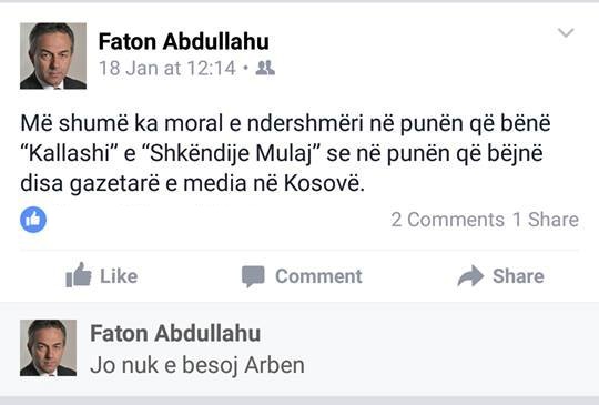 “Më shumë ka moral e ndershmëri në punën që bënë Kallashi e Shkëndije Mujaj se në punën që bëjnë disa gazetarë e media në Kosovë”, kishte shkruar ai në një postim me 18 Janar.