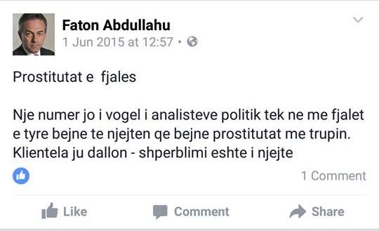 “Një numër jo i vogël i analistëve politik te ne me fjalët e tyre bëjnë të njejtën që bëjnë prostitutat me trupin. Klientela ju dallon – shpërblimi është i njëjtë”, ka shkruar Abdullahu.