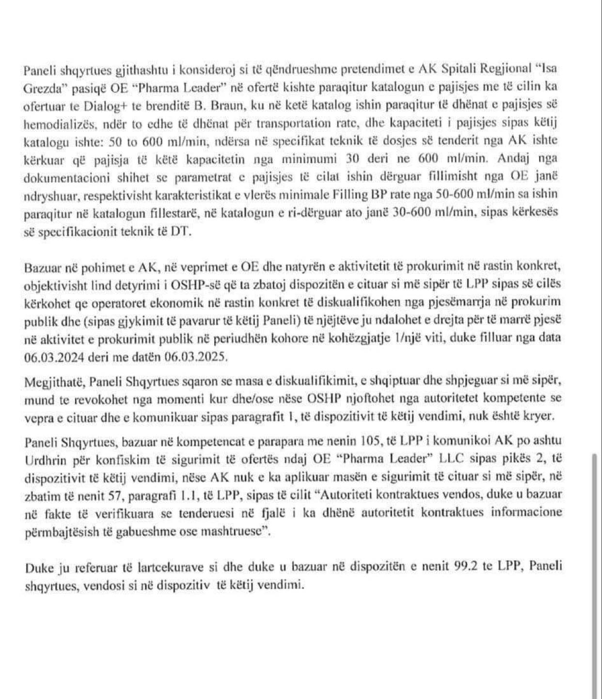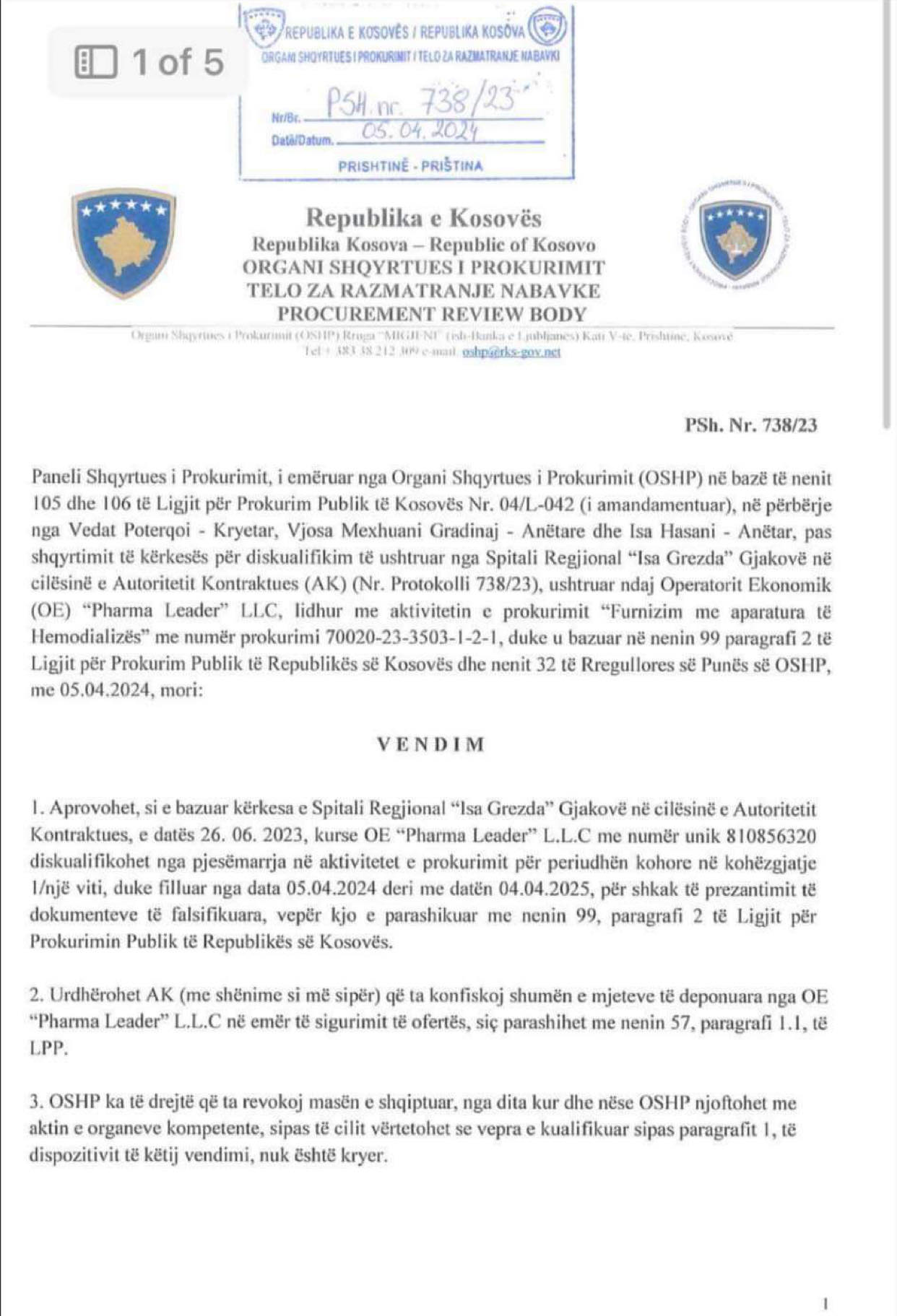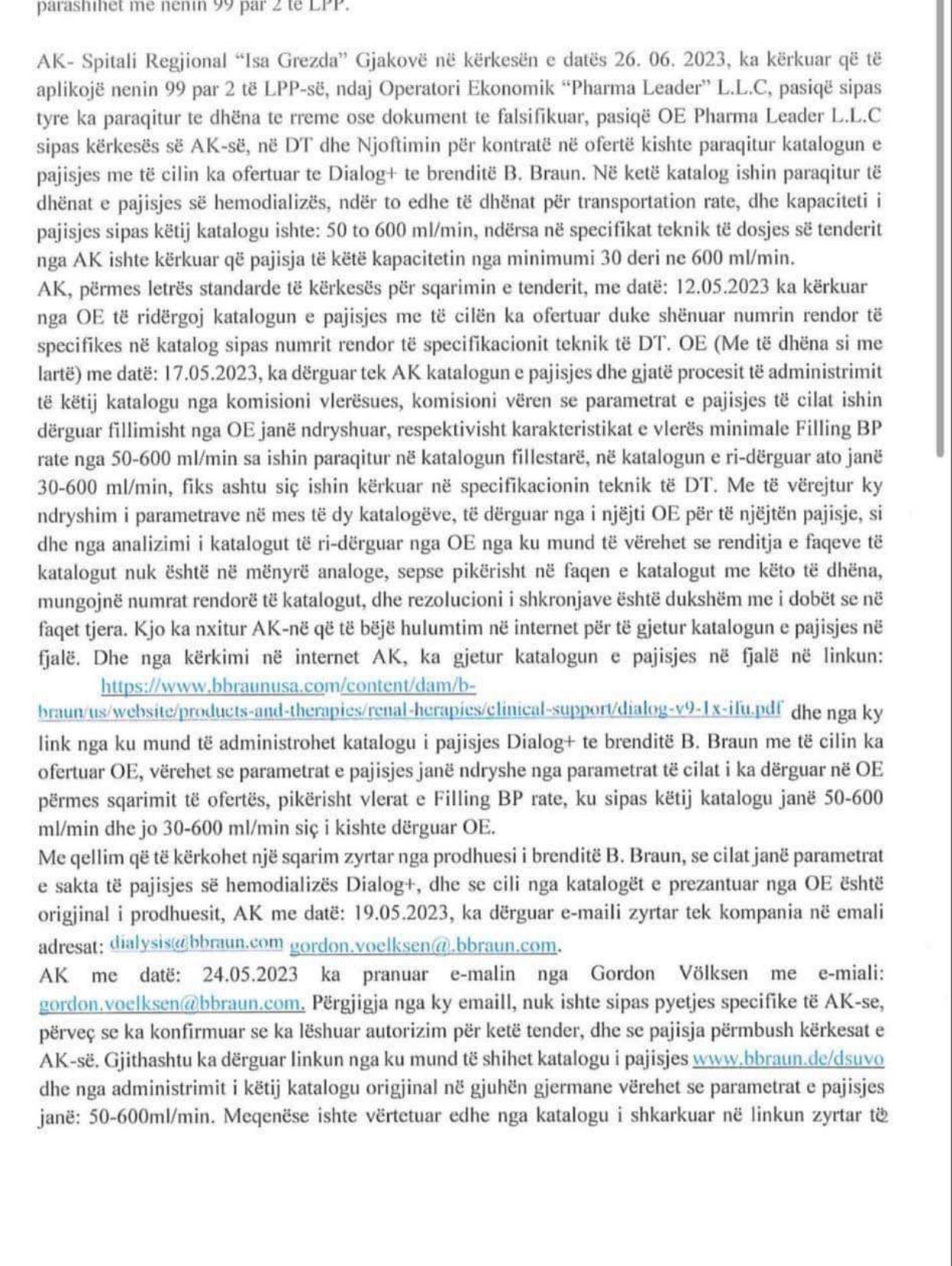“AK- Spitali Regjional “Isa Grezda” Gjakovë në kërkesën e datës 26. 06. 2023, ka kërkuar qe te aplikojë nenin 99 par 2 të LPP-së, ndaj Operatori Ekonomik “Pharma Leader” L.L.C, pasiqe sipas tyre ka paraqitur të dhëna të rreme ose dokument të falsifikuar, pasiqe OE Pharma Leader L.L.C sipas kërkesës së AK-së, në DT dhe Njoftimin për kontratë në ofertë kishte paraqitur katalogun e pajisjes me te cilin ka ofertuar të Dialog+ të brendite B. Braun. Në këtë katalog ishin paraqitur të dhënat e pajisjes se hemodializes, ndër to edhe të dhënat për transportation rate, dhe kapaciteti i pajisjes sipas këtij katalogu ishte: 50 to 600 ml/min, ndërsa në specifikat teknik të dosjes së tenderit nga AK ishte kërkuar që pajisja të ketë kapacitetin nga minimumi 30 deri në 600 ml/min” sqarohet në vendimin e OSHP’së, përcjell Insajderi.