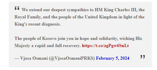 Presidentja e Kosovës, Vjosa Osmani ka shkruar sot se populli i Kosovës i uron shërim të shpejtë dhe të plotë mbretit të Britanisë së Madhe Charles III pasi u dha lajmi se ai është diagnostikuar me kancer.