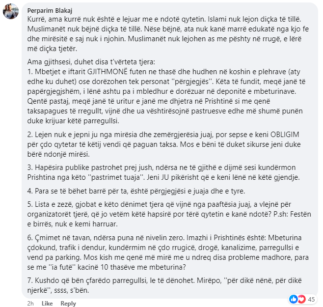 Perparim Blakaj në komentin e tij ka sqaruar se Feja Islame nuk lejon ‘kurrë’ të ndoten hapësirat që ata shfrytëzojnë për Iftar.