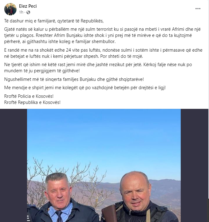 Njëri nga kolegët e zyrtarit policor që u vra sot, Afrim Bunjaku, i cili ishte në detyrë bashkë me të ndjerin, mëngjesin e sotëm, kur u përballën me sulme në veri, ka bërë një postim prekës.