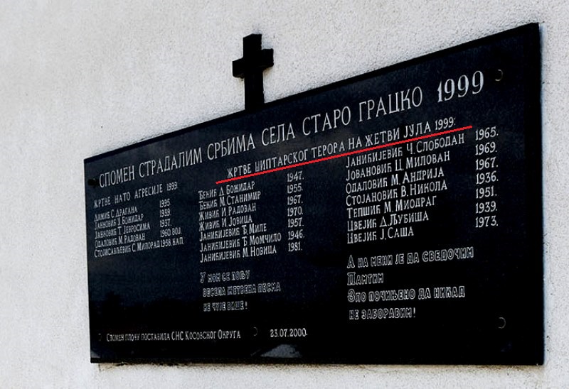 Presidenti i Republikës së Kosovës, Hashim Thaçi, sot ka vendosur kurore lulesh në memorialin e 14 qytetarëve serbë të vrarë menjëherë pas luftës, 17 vite më parë, në fshatin Grackë të Lipjanit, në të cilën është i vendosur mbishkrimi “Viktimat e terrorit shqiptar të korrikut 1999”, ku shqiptarëve u referohet me termin fyes ‘shiptarskog terora’, raporton “Kosova Online”