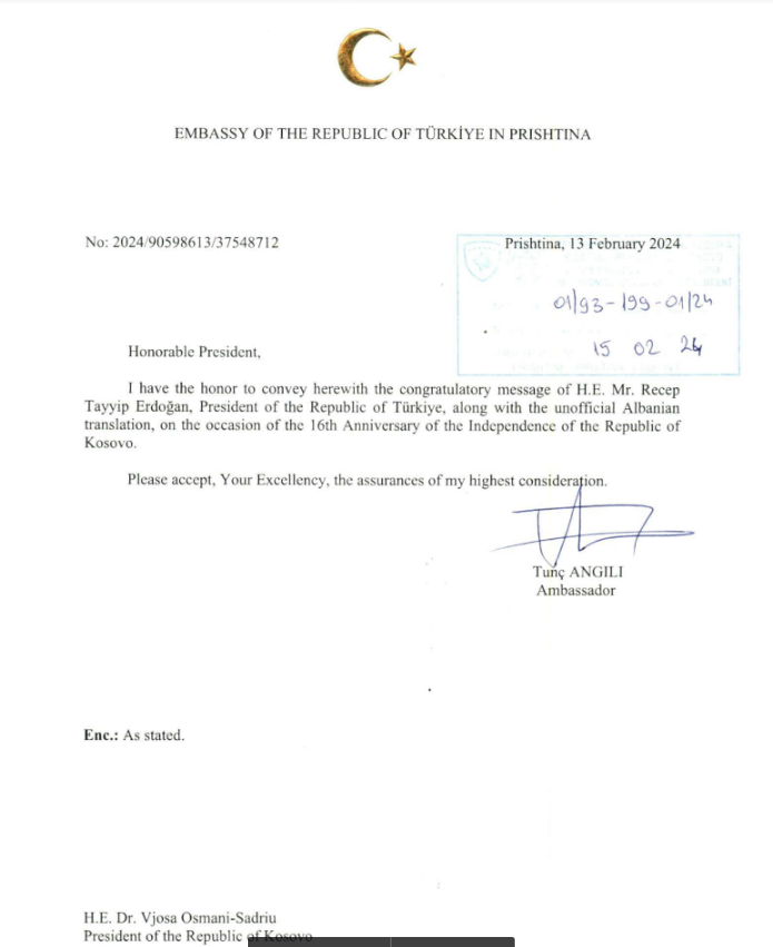 Në vijim, gjeni letrën e plotë të urimit, të dërguar nga Presidenti i Turqisë, Recep Tayyip Erdogan.