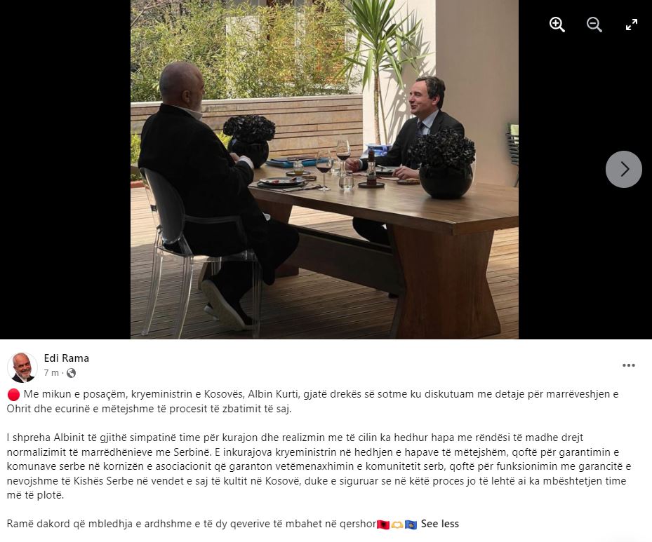 “E inkurajova kryeministrin në hedhjen e hapave të mëtejshëm, qoftë për garantimin e komunave serbe në kornizën e asociacionit që garanton vetëmenaxhimin e komunitetit serb, qoftë për funksionimin me garancitë e nevojshme të Kishës Serbe në vendet e saj të kultit në Kosovë, duke e siguruar se në këtë proces jo të lehtë ai ka mbështetjen time më të plotë”, shkroi Edi Rama në Facebook./Insajderi/