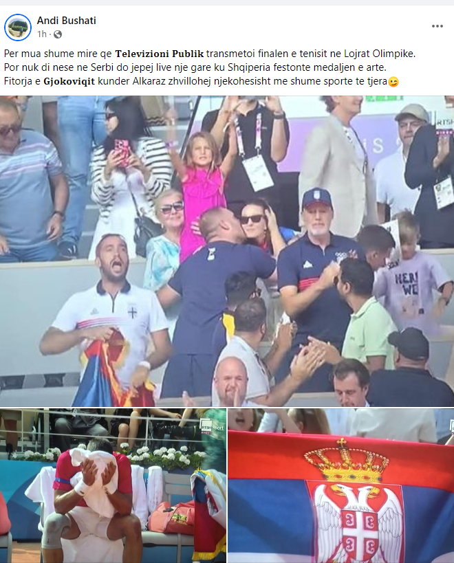 “Per mua shume mire qe 𝐓𝐞𝐥𝐞𝐯𝐢𝐳𝐢𝐨𝐧𝐢 𝐏𝐮𝐛𝐥𝐢𝐤 transmetoi finalen e tenisit ne Lojrat Olimpike. Por nuk di nese ne Serbi do jepej live nje gare ku Shqiperia festonte medaljen e arte”, shkroi Bushati në një postim në Facebook.