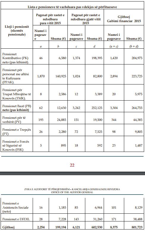 Në tabelën e hartuar nga auditorët shihet se për cilat kategori të punësimeve janë paguar pensionet edhe pas vdekjes.