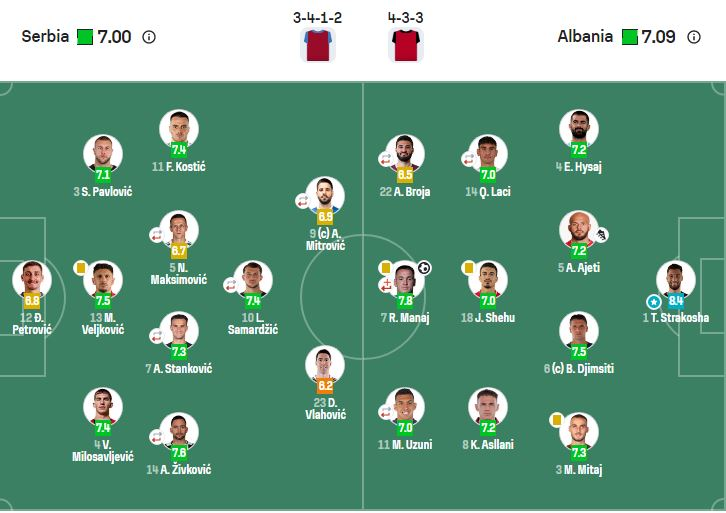 Në krahun tjetër, Armando Broja ka rezultuar më i dobëti për Kombëtaren shqiptare, me një vlerësim prej 6.5, ndërsa sulmuesi i Serbisë, Dusan Vlahovic, ka marrë notën më të ulët të gjithë ndeshjes 6.2 duke u renditur si lojtari më pak efektiv në fushë.