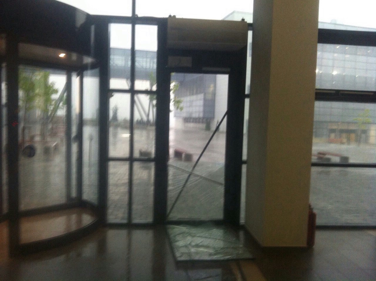 E pasojat e këtyre kushteve atmosferike të ditës së hënë në Prishtinë janë thyerja e disa xhamave të objektit dhe vërshimi i bodrumit të saj.