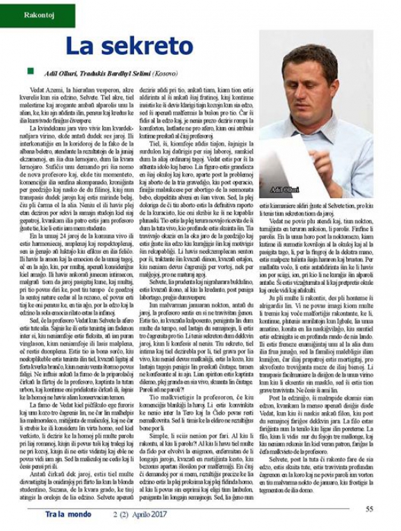 Tregimi “E fshehta” i autorit shqiptarë Adil Olluri është publikuar në revistën kulturore “Tra la mondo”, një nga peroidikët më të rëndësishëm në botën esperantiste.