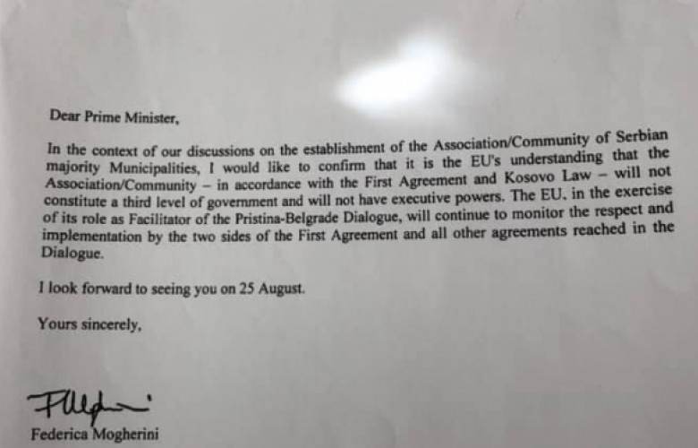 Ndërkaq “të parëndësishme” i quan Letrën e Mogherinit drejtuar ish-kryeministrit Isa Mustafa ku garantohej se BE nuk lejon që Asociacioni të jetë nivel i tretë i pushtetit, si dhe një artikull të përbashkët të Derek Chollet/Gabriel Escobar botuar më 31 janar të këtij viti, se çfarë do të jetë e çfarë nuk do të jetë Asociacioni i Komunave me shumicë serbe.