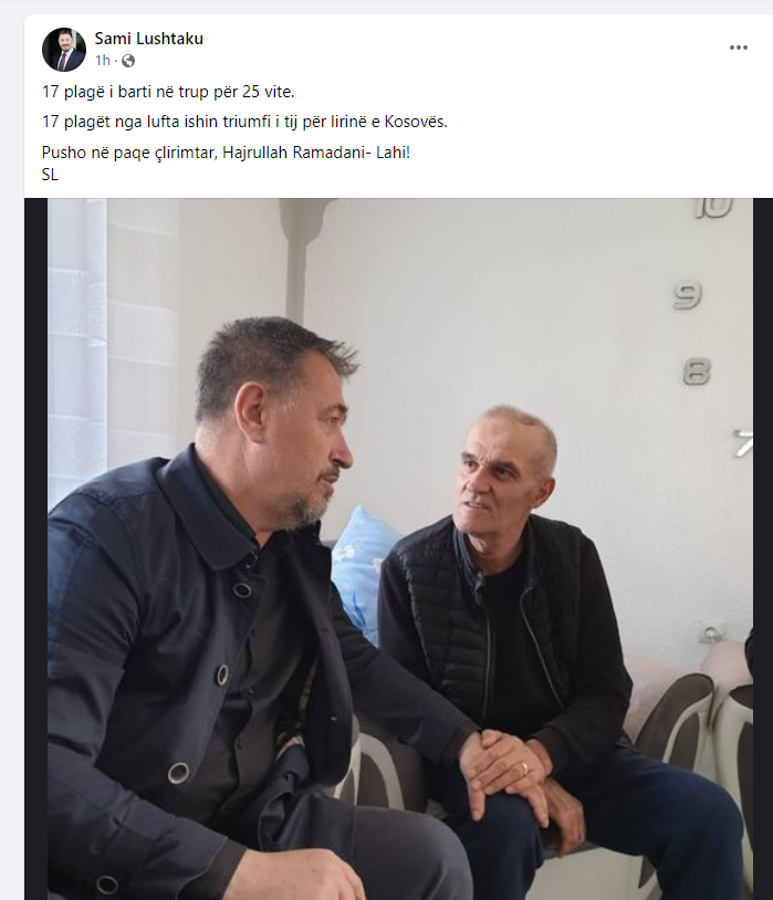 17 plagë i barti në trup për 25 vite. 17 plagët nga lufta ishin triumfi i tij për lirinë e Kosovës. Pusho në paqe çlirimtar, Hajrullah Ramadani- Lahi!”, shkroi Lushtaku./Insajderi.org/