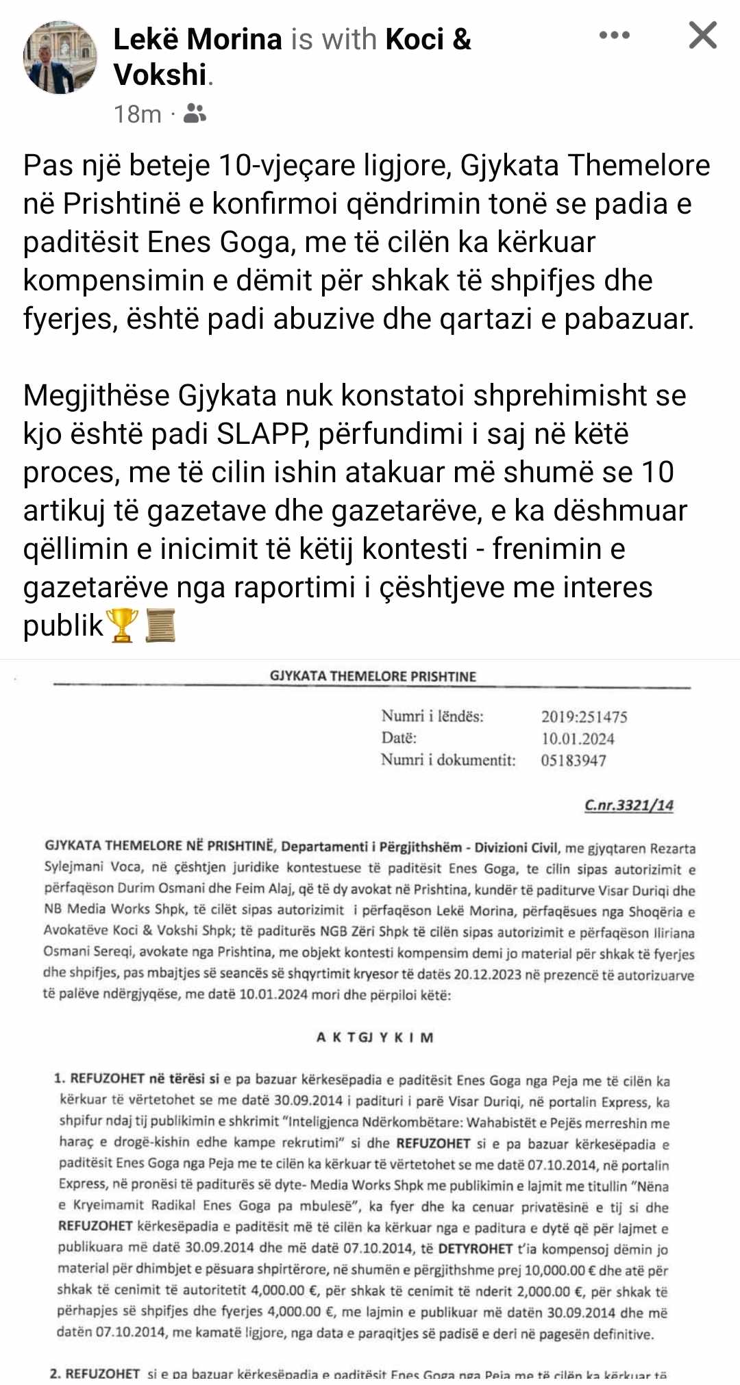 “Pas një beteje 10-vjeçare ligjore, Gjykata Themelore në Prishtinë e konfirmoi qëndrimin tonë se padia e paditësit Enes Goga, me të cilën ka kërkuar kompensimin e dëmit për shkak të shpifjes dhe fyerjes, është padi abuzive dhe qartazi e pabazuar”, shkroi ai në Facebook.