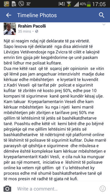 Një orë më vonë, reagoi Rrahim Pacolli, kushëriri i Behxhet Pacollit, që drejton një prej kompanive më të mëdha të sigurimeve.