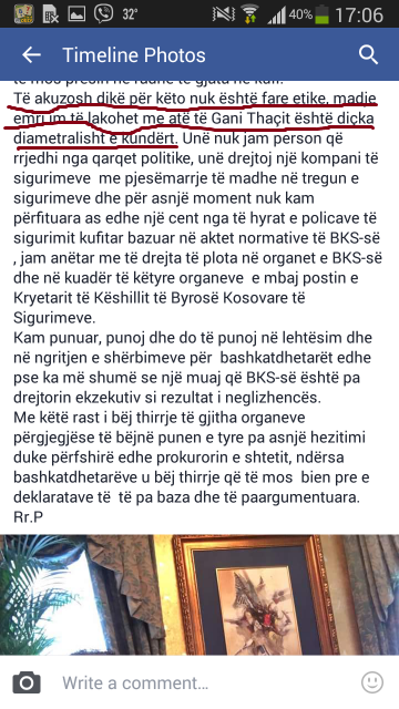 “Të akuzosh dikë për këto nuk është fare etike, madje emri im të lakohet me qëllim te dezinformimit te opinionit është diçka diametralisht e kundërt me të vërtetën”, shkroi Pacolli, pasi përmirësoi statusin e tij në Facebook.