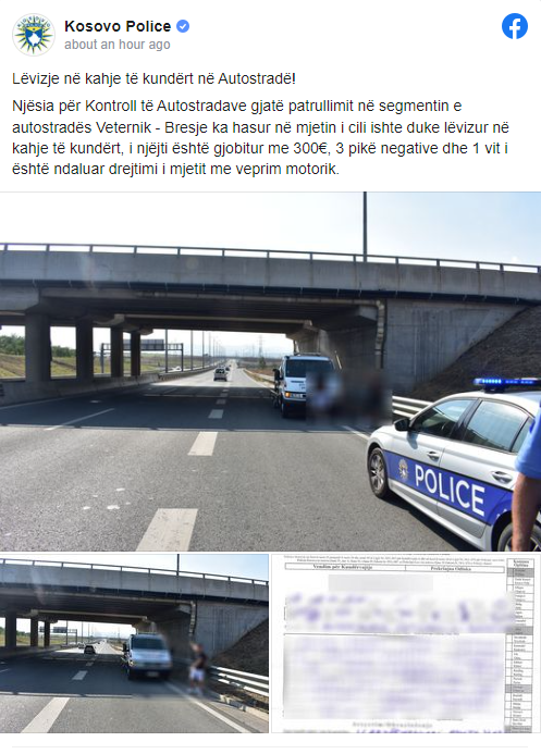 “Njësia për Kontroll të Autostradave gjatë patrullimit në segmentin e autostradës Veternik – Bresje ka hasur në mjetin i cili ishte duke lëvizur në kahje të kundërt, i njëjti është gjobitur me 300€, 3 pikë negative dhe 1 vit i është ndaluar drejtimi i mjetit me veprim motorik”, thuhet në njoftimin e policisë.
