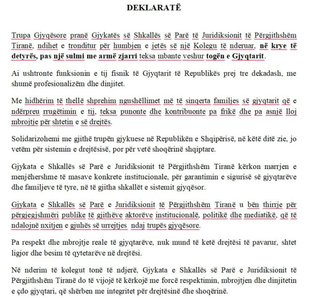 Trupa Gjyqësore pranë Gjykatës së Shkallës së Parë të Juridiksionit të Përgjithshëm në Tiranë ka shprehur tronditjen e thellë pas vrasjes së gjyqtarit Astrit Kalaja, i cili u qëllua me armë zjarri ndërsa ushtronte detyrën.